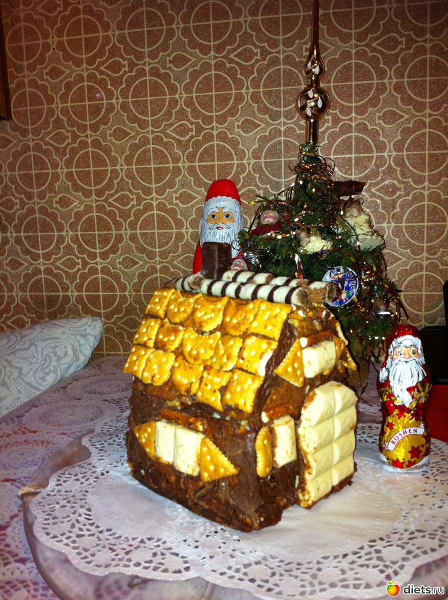 С пряничным домиком хорошо смотрятся новогодние шоколадные деды-морозики. И, конечно, елка!
