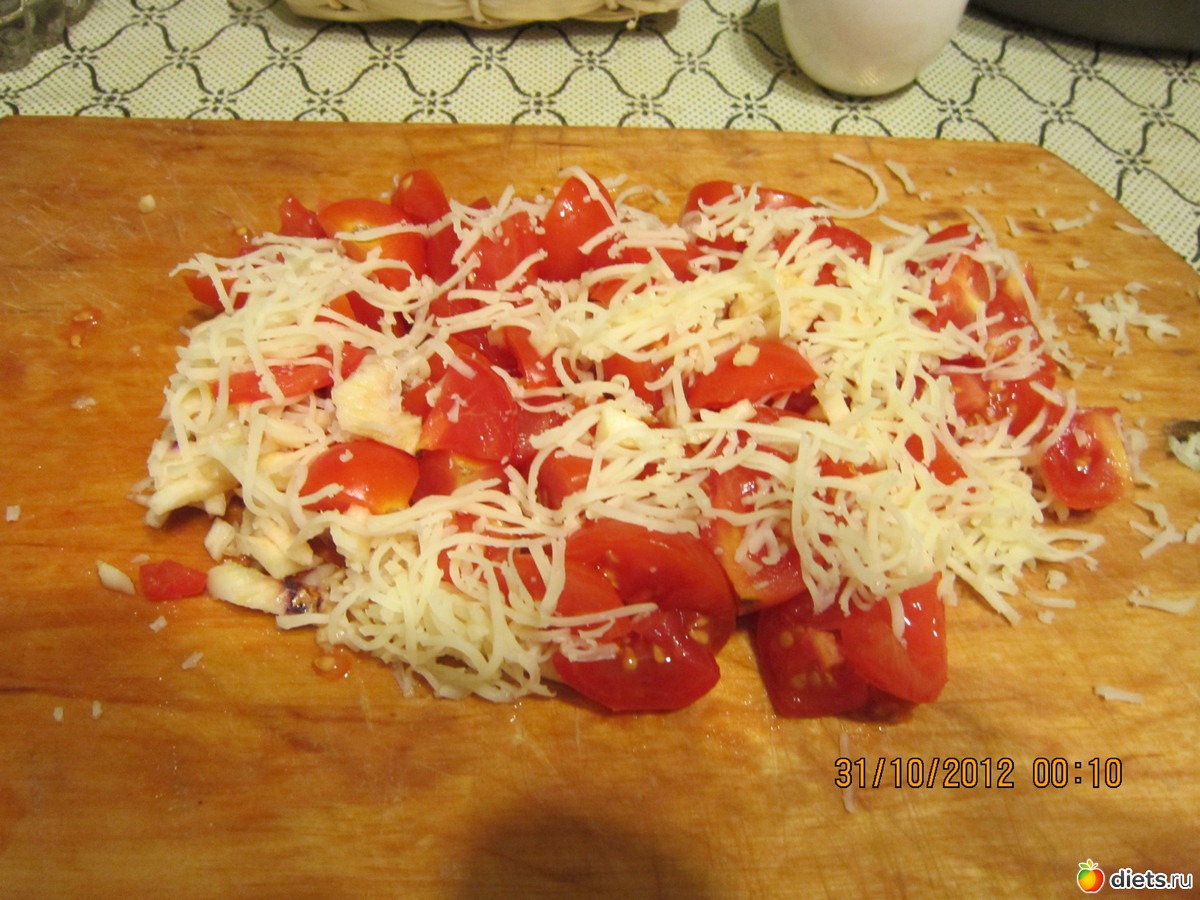 «нарезаем помидорки, чеснок и натираем сыр.»
