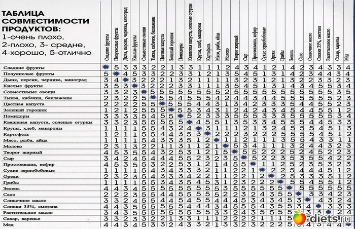 таблица сочетания продуктов