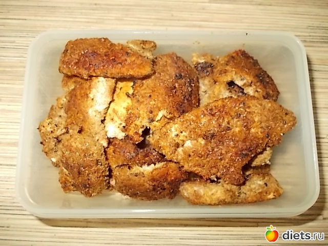 Куриная грудка+397г, 457ккал, Оливк, масло - 15 г-135 ккал, Слив, масло - 25 г, 166ккал, Яйцо-52г, 82ккал, соль, перец, Клетчатка (у меня Сибирская клетчатка с черникой) 50г-18ккал, Филе грудки порезать, отбить, поперчить, посолить, обмакнуть в яйце, обвалять в клетчатке, обжарить в масле на тефалевской сковороде, Получилось 515 г, 157ккал на 100г