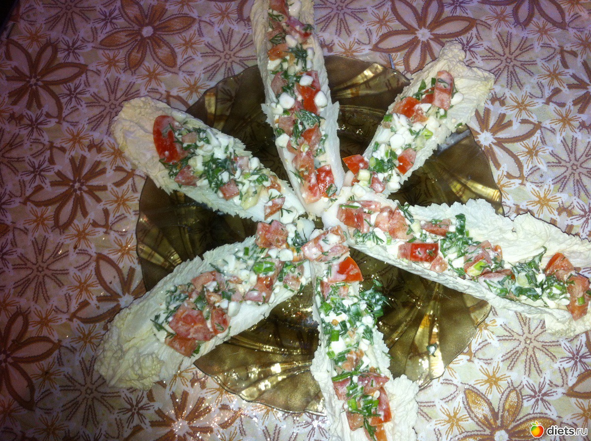 «Помидоры, творог зерненный от"Простоквашино", чеснок и на лист пекинки. Очень вкусно. Можно и без пекинки.)))»