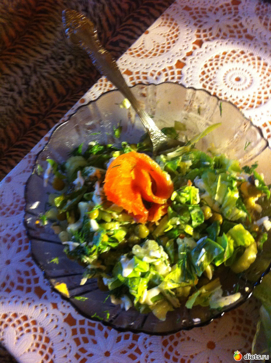«Состав: сельдерей (30 г), салатные листья -55 г, укроп - 15 г, 1 яйцо (потереть), горошек консервированный - 80 г.»