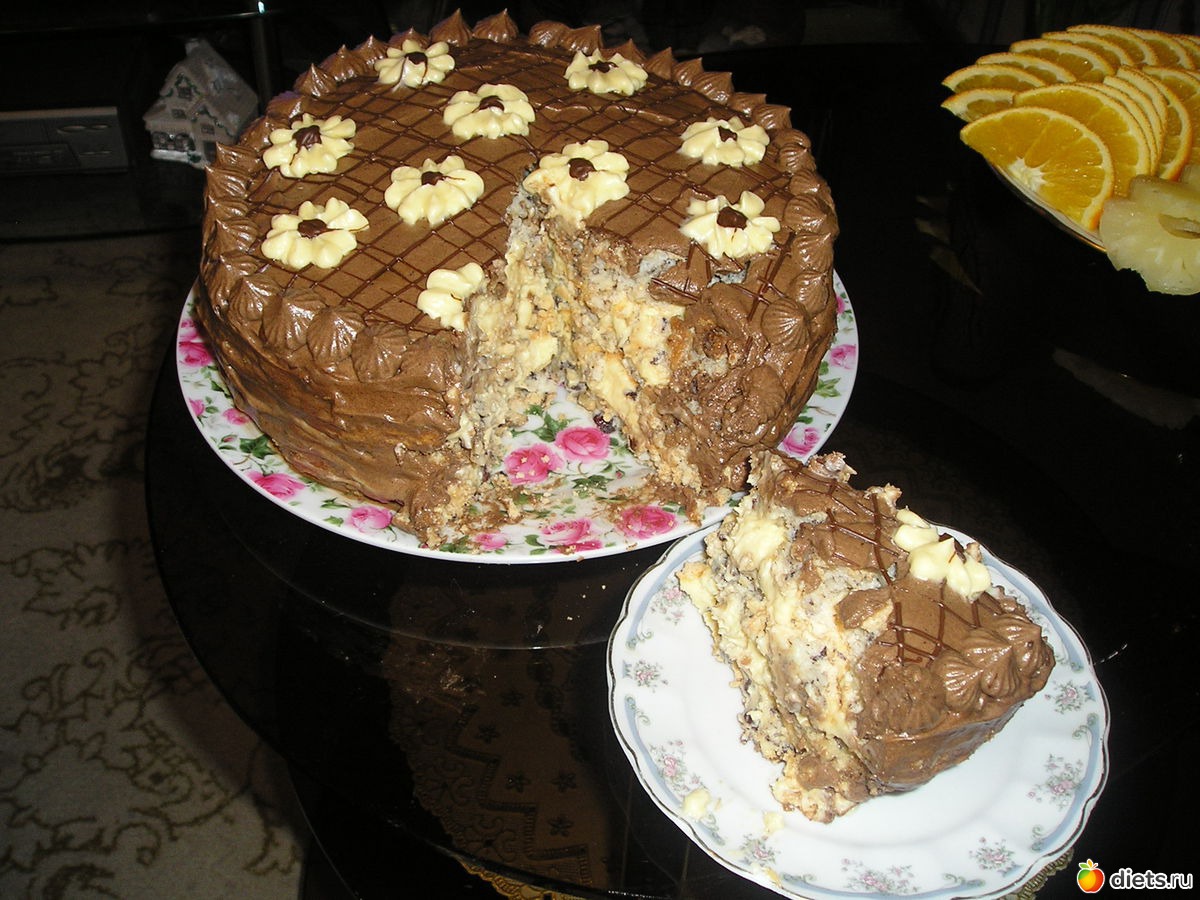 Таких коржей надо сделать три штуки.Лучше за день до сборки торта чтоб коржи выстаились.На следующиц день Снимаем бумагу,взбиваем крем и собираем торт. На крем у нас пойдут желтки от яйц которые остались от приготовления коржей.Крем Шарлотт : в кастрюльку налить 350 мл.молока,добавить 300 гр.сахара и вскипятить.В отдельной кастрюльке растереть 12 желтков и постепенно,постоянно мешая добавить в них половину молочного сиропа.Хорошенько взбить венчиком и всю смесь вылить постепенно в оставшийся сироп .Мешать все время венчиком чтоб яйца не свернулись.Довести смесь до кипения .Снять с огня.Остудить.Пока смесь остывает не забывать несколько раз размешивать.Взбить 500 гр.сливочного масла и постепенно ,небольшими порциями ввести остывшую яично-молочную смесь и ванилин.Крем готов .Отложить 1/3 крема и добавить в нее 20 гр.какао.Это для украшения.Коржи промазать кремом не жалея.Крема между коржами должно быть по толщине почти как сами коржи.Сверху обмазать торт шоколадным кремом и украсить орехами и кремовыми цветами.Торт получается очень большой приблизительно 2 кг. и очень вкусный Удачи!!!