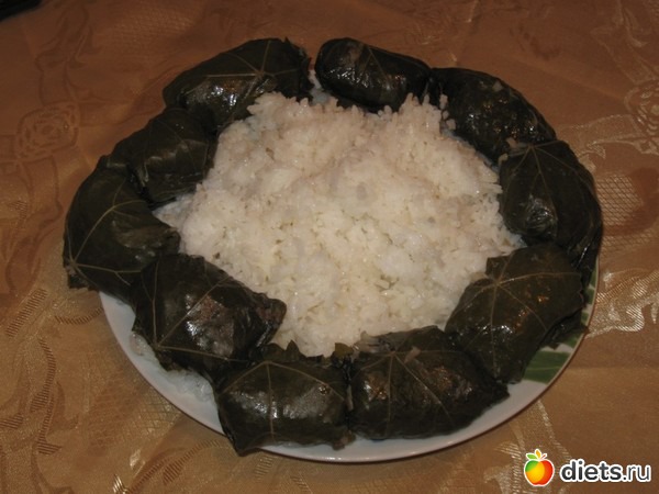 фарш перемешать,завернуть в виноградные листья.если листья свежие-проварить их немного в подсоленной воде до мягкости. листья из банки-сполоснуть.