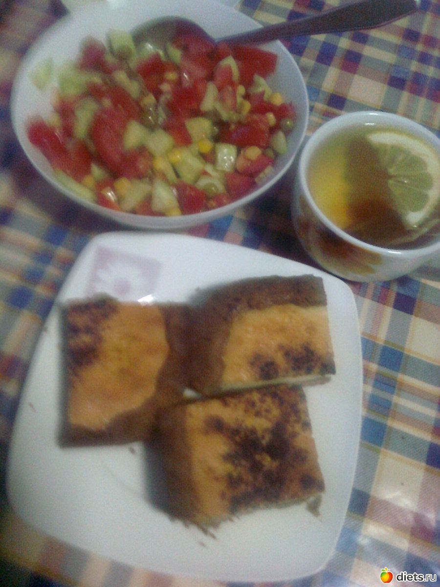 «чай с лимоном, творожный пирог и салат из свежих огурчиков с помидорами.»