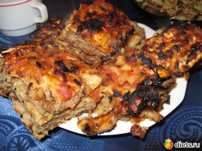 В пайрекс вылить 3 ложки соуса и положить замоченную мацу,на неё слой баклажанов,затем слой мацы,слой фарша и т.д.Остатками соуса полить верхний слой мацы.Накрыть фольгой и запекать в духовке при средней температуре примерно час с четвертью.