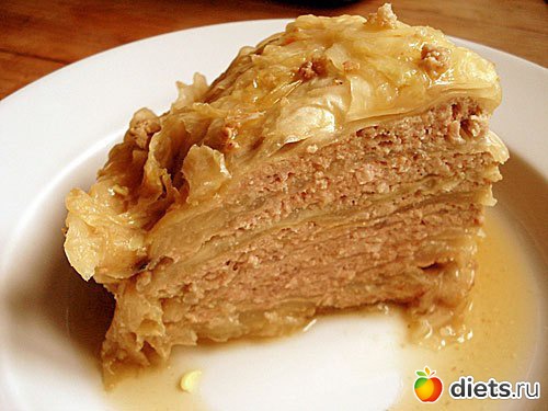 В смазанную маслом форму уложим слоями, чередуя, капустные листья и фарш. Каждый слой посыпайте тертым сыром. Зальем все яйцом, взбитым со сметаной, и запекаем до готовности.