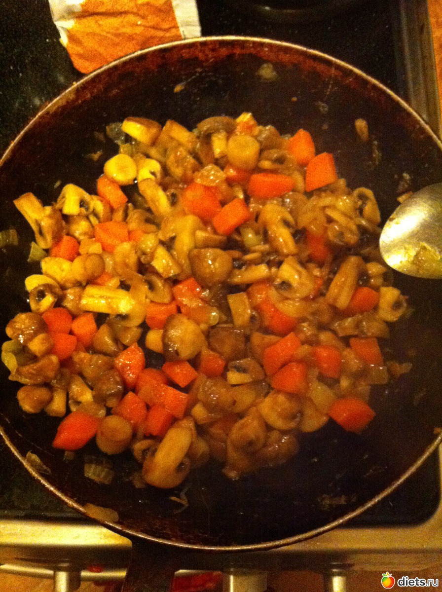 «Обжаривание лука, моркови и шампиньонов для плова»