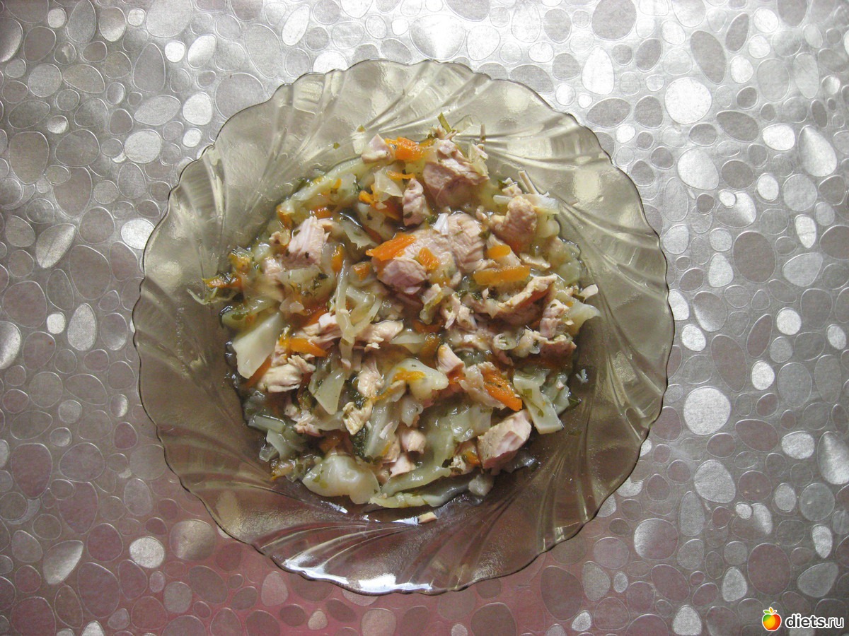 «Грудка индейки тушеная с капустой, луком и морковью.»