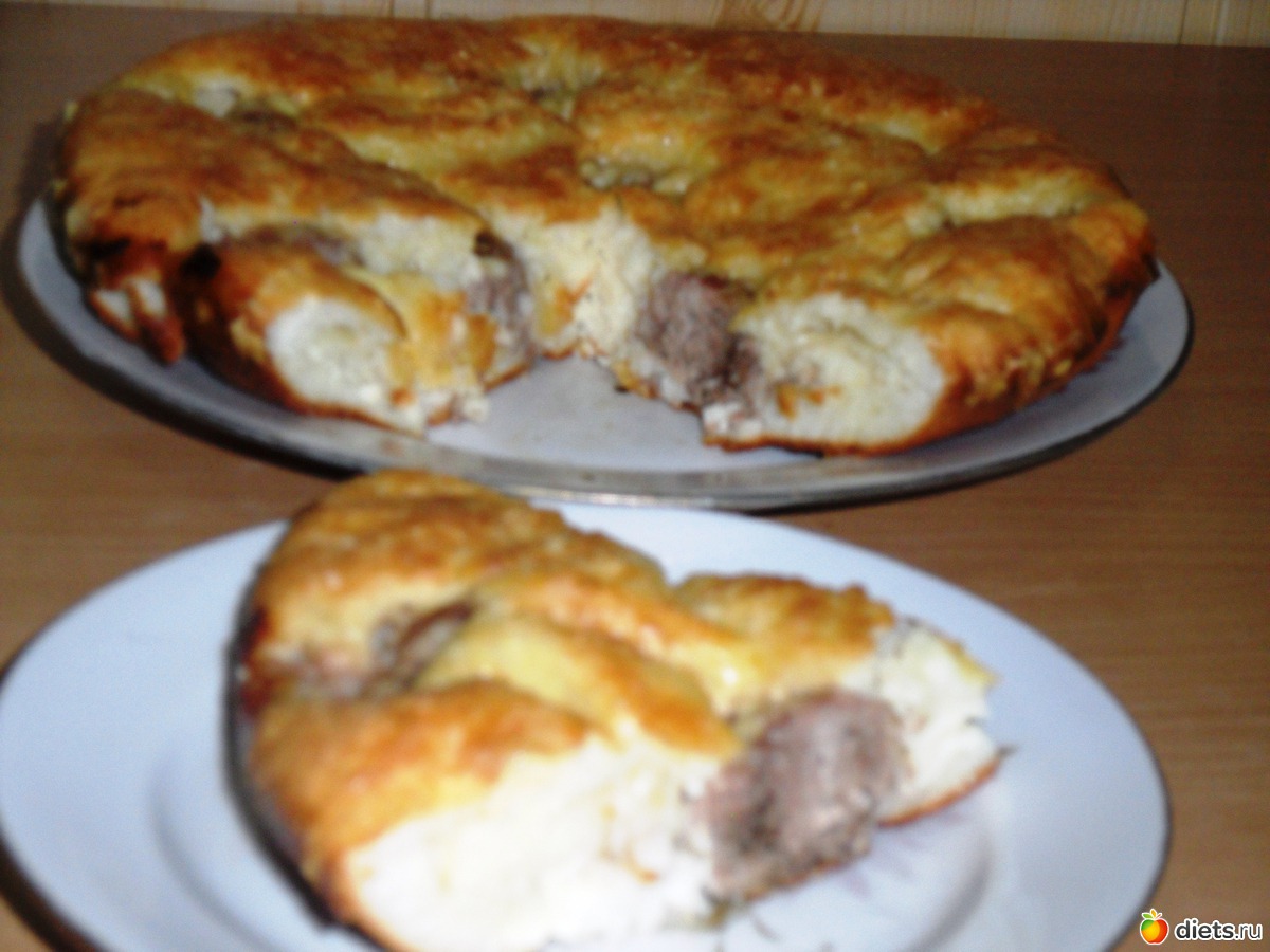 Готовому пирогу дать некоторое время постоять и впитать в себя выступивший сок фрикаделек.