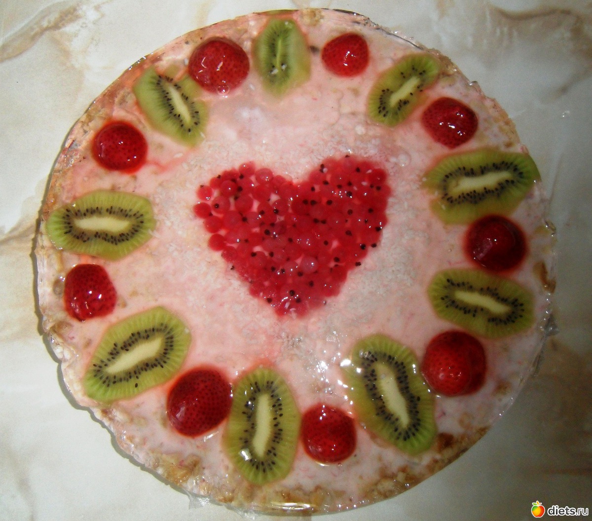 Печенье превратить в крошку, масло растопить.Смешать масло с печеньем.Желатин залить водой, дать набухнуть, довести до кипения, чуть охладить и вылить в йогурт, посластить сах.пудрой. Приготовить Желе для торта (способ приготовления написан на пакетике).
