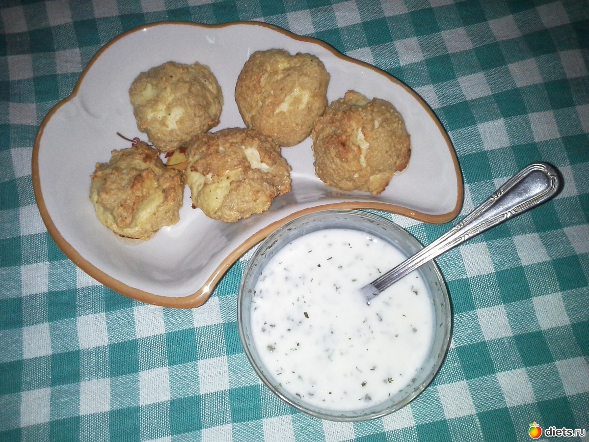 Из фарша на ладони формируется лепешечка (фарш получается жидковат, но ничего!) и про центру- ложечка начинки и формируется шарик. Запекала в духовке до светло-золотистой корочки. А соус- это кефир с зубчиком чеснока, укроп, базилик, петрушка.