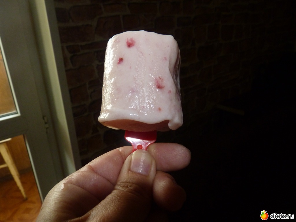 Берем йогурт (у меня с кусочками фруктов) втыкаем в него палочку и кладем в морозилку. Когда замерзнет ваше мороженное готово.