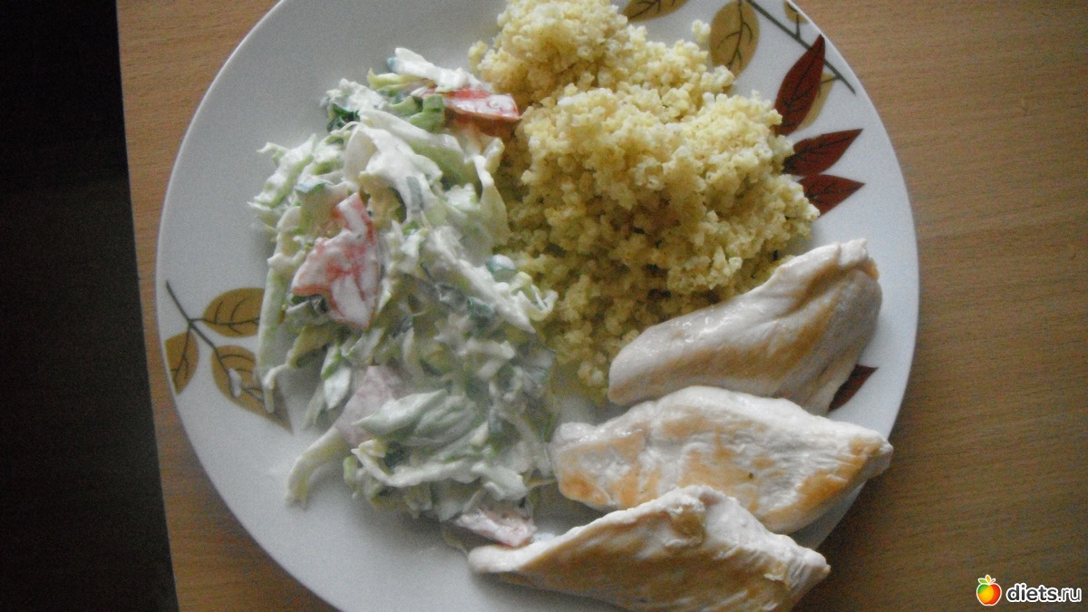 Гречка, курогрудь, овощной салат с льняными семечками и кунжутом