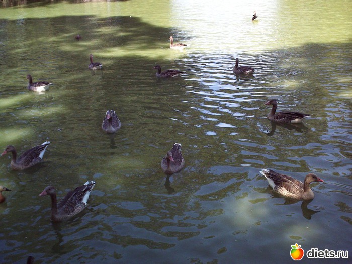 Утки плавают в большом пруду.