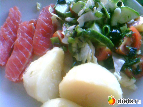 Ужин - отварная молодая картошка, 50 г слабосоленой семги, овощной салатик с подсолнечным маслом: