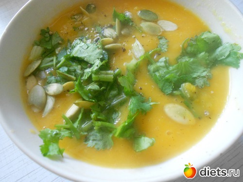 Обед - морковный супчик с тыквенными семечками, зеленью и цельнозерновым тостом, оставшимся за кадром: