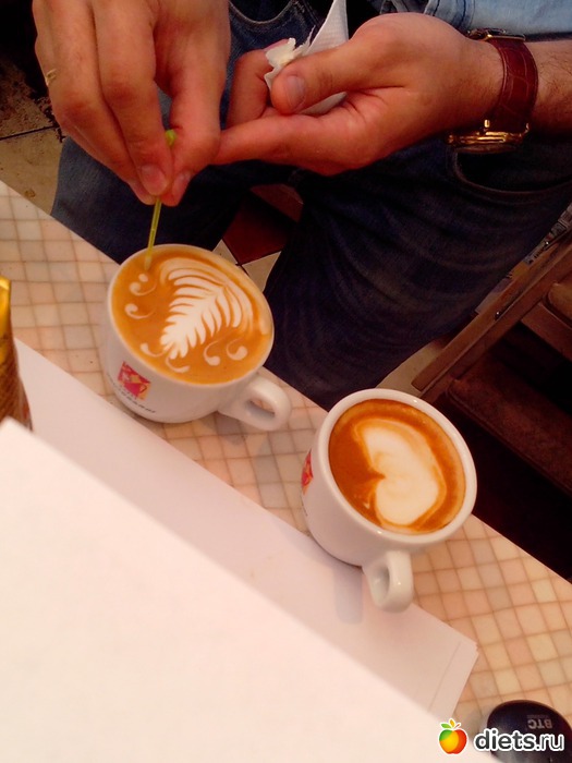 Потом он показал нам мастерство плавного вливания взбитого молока под кофе, тонирование, и рисование кофейной пеной по молоку: