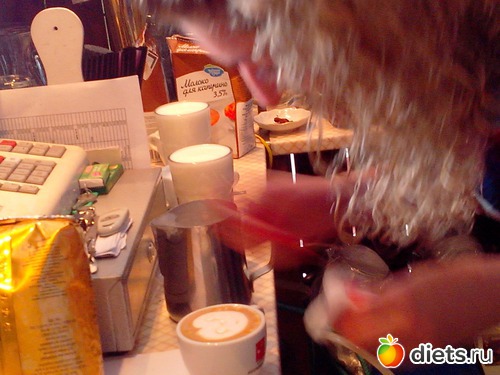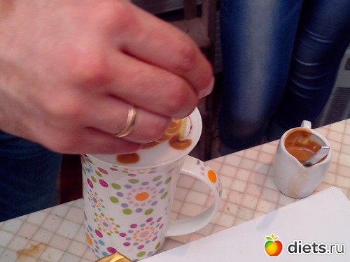 Дальше наш гуру колдовал над чашкой латте, оказывается, что правильный латте только в фарфоровой высокой чашке!
