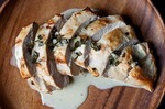 5. Затем достать противень аккуратно при помощи ножа и вилки нарезать на крупные ломтики выложить на тарелку полить сверху сливочным соусом и подавать.
