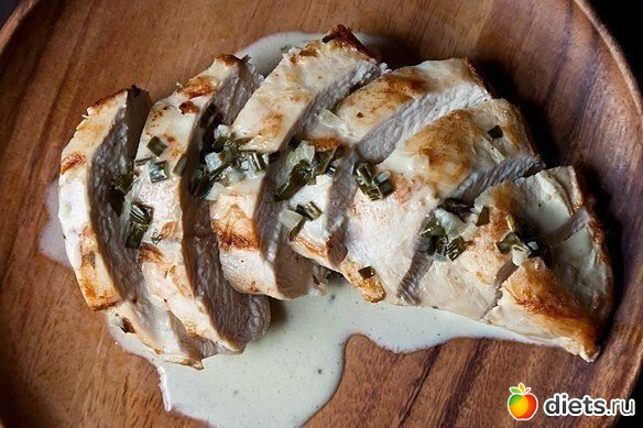 4. Затем когда пройдет 5-10 минут, вынуть курицу из духовки и залить смесь сливок с луком, поставить обратно до приготовления (примерно 30 минут, это зависит от размера грудок)