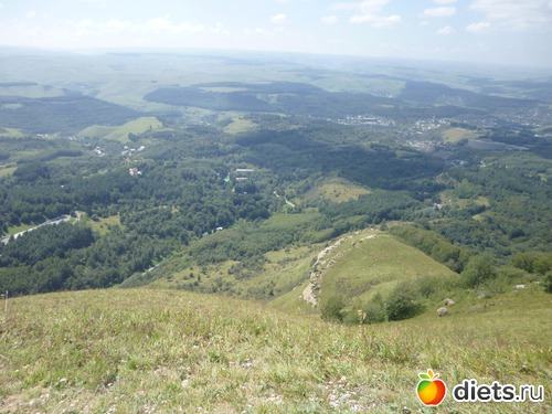 Мы наметили пройтись по маршруту до вершины хребта. Там есть станция канатной дороги, но мы шли пешком. Прошли по хребту дальше, до горы Малое седло(1332м). Долго стояли там. Эльбрус не видели - он скрылся в дымке, но все остальное - красота неописуемая. Аж дух захватывает. Попутно хочу дать совет - ходить лучше в спортивной обуви. Я боюсь, что я мои босоножки скоро добью. Обедали мы наверху. Про качество еды сказать ничего не могу - вкусно, но цены