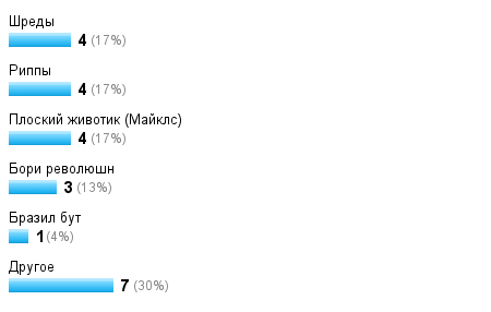 И еще начала балетную тренировку с Лией Сараго (через день с кардио), пока только для ног попробовала - была слегка в шоке, со стороны ты почти ничего не делаешь, а на самом деле все бедра сами по себе становятся пунцовыми, а через минут 10 - и трястись мелкой дрожью. Зато смотришь не ее ноги, и понимаешь, что это то, к чему стоит стремиться.