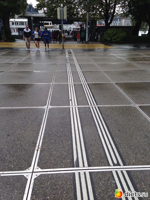 Для незрячих есть специальные дорожки, по которым они могут дойти куда угодно. Мы поначалу очень удивлялись, что это за такие полосочки белые на полу, причем повсюду, а потом увидели, как один незрячий человек идет со своей палочкой прямо по этим полосочкам и стали тогда обращать на них больше внимания.