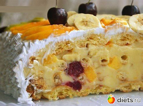 На верхний корж выложить фрукты (груши, персики, бананы и черешню). Поставить в холодильник для пропитки и застывания крема.