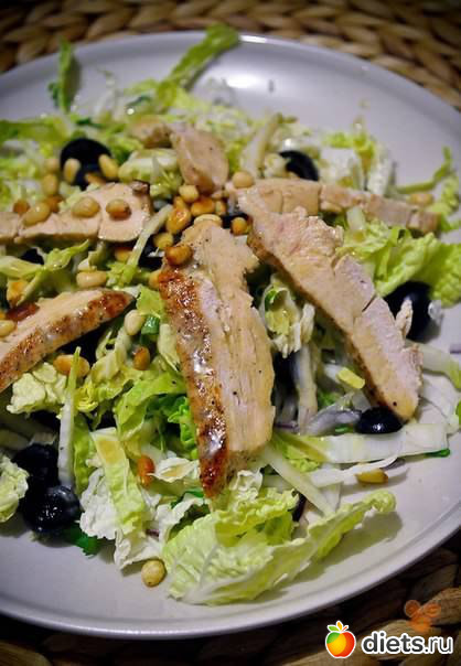 Курица, чернослив, яйцо, огурец, грецкий орех, йогурт.