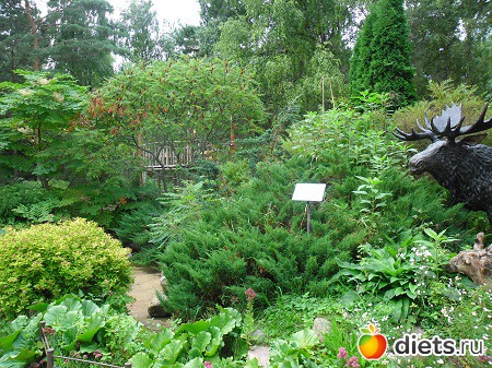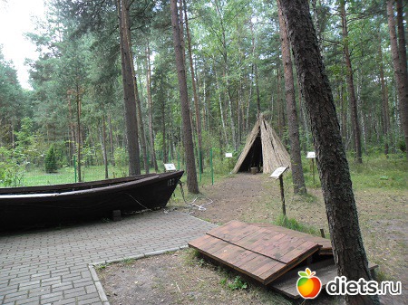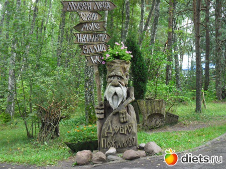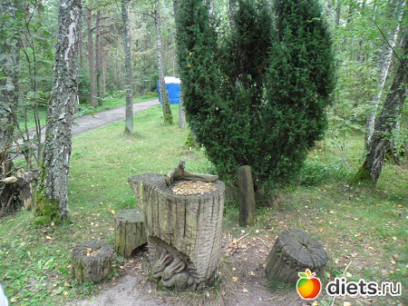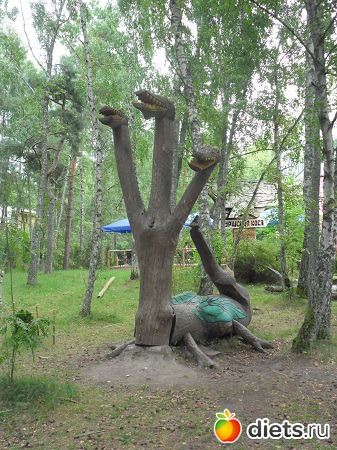 По всему парку вот такие скульптуры. Есть красивые резные скамейки, лодки, шалаши. В одном живет живой лось.