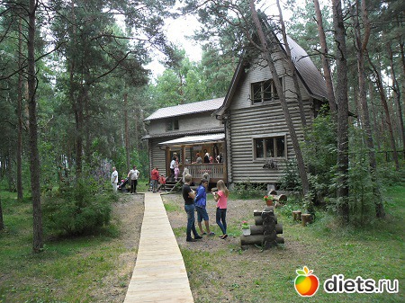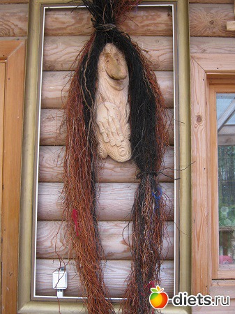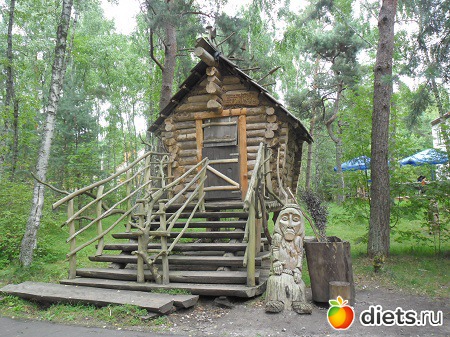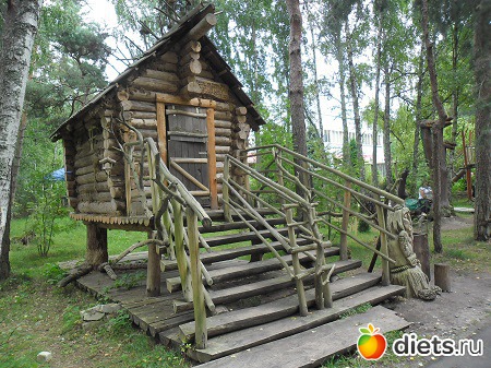 Избушка поражает! На крыше поганки ( деревянные), лапы настоящие. Бабка Ёжка - все как полагается.