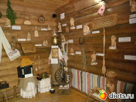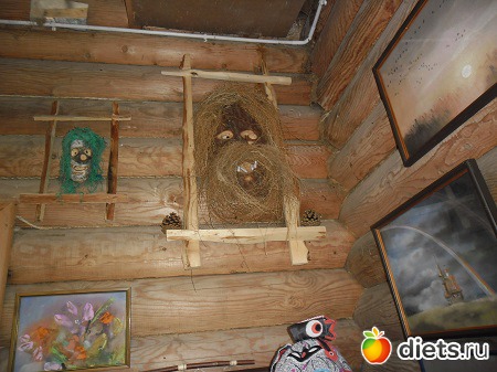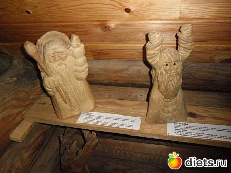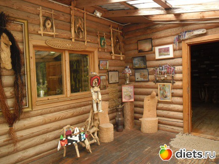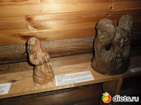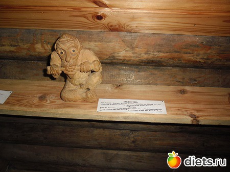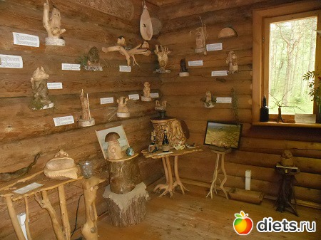 а этот домик - и есть сам музей. У входа встречает женщина в народном костюме. Сам художник тоже сидит в отдельной комнате, все рассказывает, показывает. Тут же режет фигурки. Леших, Водяных и прочей нечисти. и везде пояснения написаны, как называется и что обозначает.