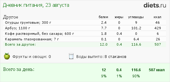 были погрешности, ввела огурцы и арбуз, выпила 3 чашки кофе с карамелькой и то наверное по привычке. Утром привыкла пить кофе, а могла обоитись просто водой. Но это же первый день такой строгий. Из меня столько вышло воды... мне кажется что я каждый час в туалет бегала ( извините за подробности), но у меня это проблема я вся в отеках.