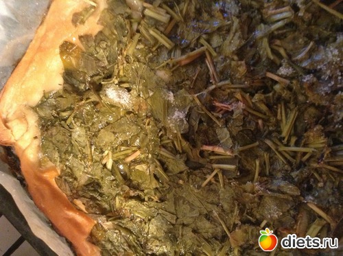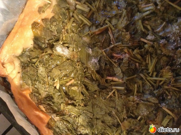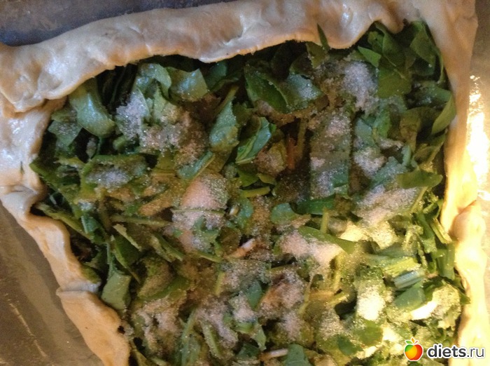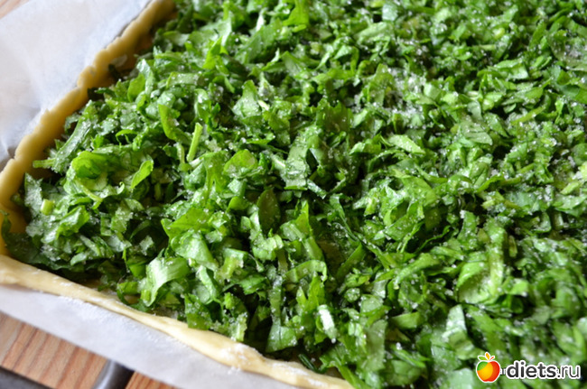 Щавеля должно быть много. На пирог нужно его пару хороших пучков. Стебли на всякий случай общипываем, листики режем "лапшой" и насыпаем прямо на тесто, чуть отступив от краев.