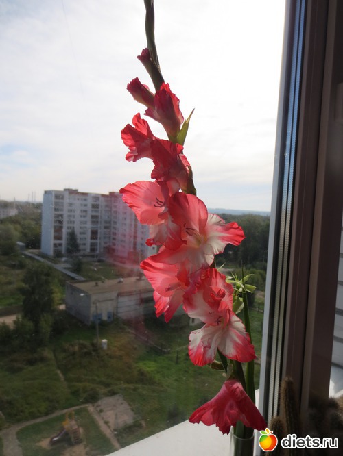 распустился гладиолус, он у нас один пока. срезали домой, жалко было оставлять там на целую неделю.