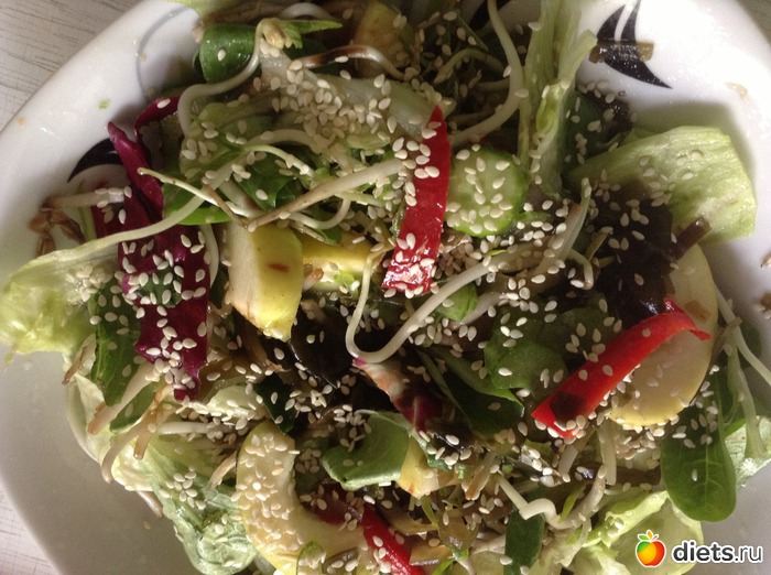 Ланч - салатные листья, проростки, яблоко, сельдерей, огурец, перец, морская капуста, кунжут: