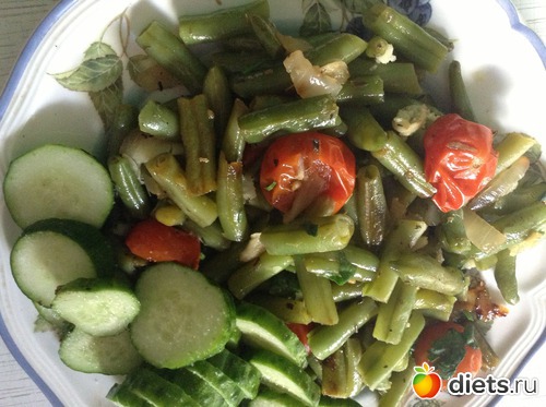 Обед - суп-пюре из подручных овощей и "белковая" зеленая фасоль с луком и помидорчиками и огурец:
