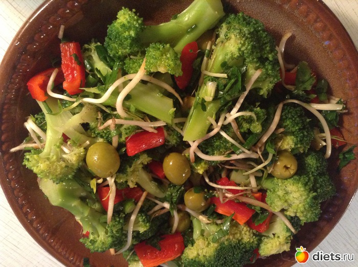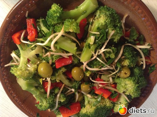 Готовится салат так: брокколи разбирается на соцветия и отваривается в течение 3 минут, к ней добавляется сладкий перчик, оливки (щедрая горсточка, у меня были фаршированные лимоном), зеленый лук, петрушка, я еще проростков добавила (в рецепте обошлись без них); заправляется салат солью, перцем, бальзамико и оливковым маслом по вкусу.