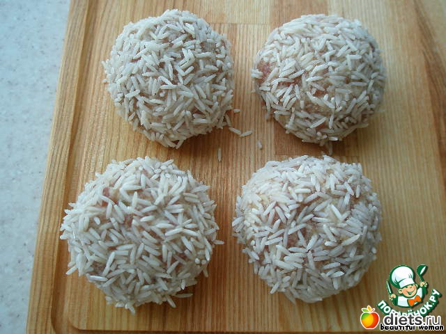 Процесс: Отвариваем 200 гр риса в 300 мл подсоленной воде до полуготовности(вода вся впитывается в рис). Разминаем фарш, добавляем 2 яйца, перец, соль по вкусу, лук трем на терке или пропускаем в комбайн(что бы был по мельче). Формируем шарики и готовим! Я их варю в казане в небольшом кол-ве воды, т.к в пароварке они получаются суховатыми. Но на вкус и цвет товарищей нет.