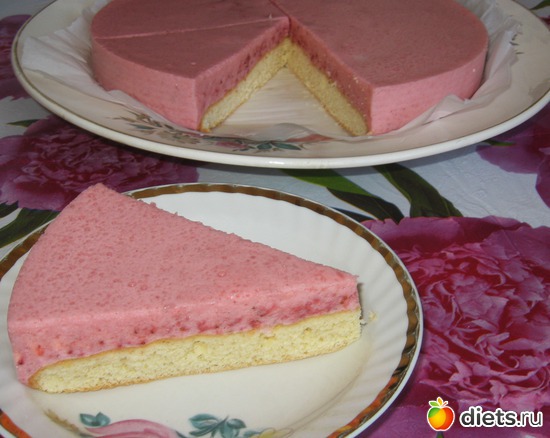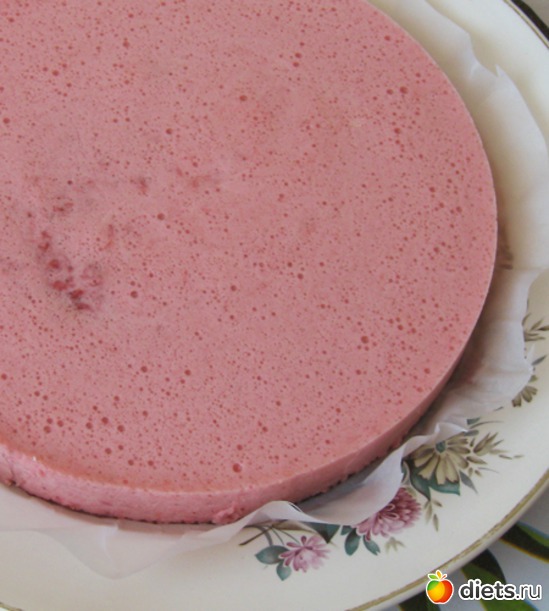 Теперь все просто. На дно формы кладем корж, на него выливаем начинку. Можно украсить клубникой сейчас, можно потом, когда все застынет, а можно вообще не украшать. И в холодильник. Я обычно ставлю на ночь. Потом аккуратно раздвигаю форму, чтоб не повредить нежное желе. Держите под рукой нож на всякий случай, если не захочет отлипать. И аккуратно, прямо вместе с калькой перекладываю на блюдо. А можно без кальки.