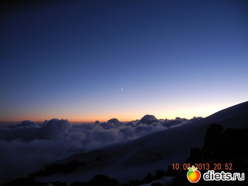 На Эльбрусе воздух очень разряжен в связи, кислорода не хватает. Но я и вся наша группа чувствовали себя более-менее комфортно, так как у нас была акклиматизация, не такая длительная, но все же. До 4400 поднялись к 7 вечера, разбили палатки на снегу, подогрели ужин, напились чаю и легли спать на несколько часов.