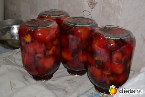 На 1 л воды – 100 г сахара и 15 г соли, опять вскипятить. Залить помидоры со сливами и закатать. Убрать под шубу до остывания!