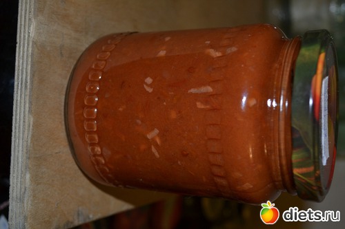 Все пропустить через мясорубку, варить 1,5-2 часа. За 30 минут до окончания варки добавить 1,5 ст. ложки соли,200 г сахара,1 ч. ложку молотого красного перца,2 лавровых листа,4 шт.гвождики,1 ст. ложку 9%-ного уксуса,100 г тертого чеснока.