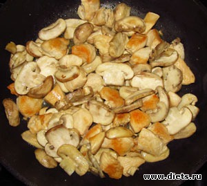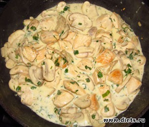 Добавить грибы к курице и обжаривать, пока они не начнут выделять сок.