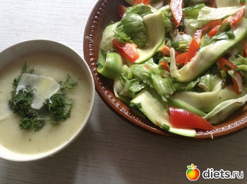 Обед - суп-пюре из цветной капусты с кабачком и салат с кабачком и сладким перцем: