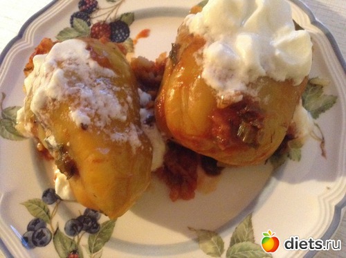 Ужин - перец, фаршированный рисом, морковкой и корнем сельдерея, с йогуртом вместо сметаны: