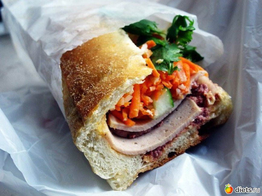 Бан ми: сэндвич с мясом (чаще всего свининой или печёночным паштетом), маринованной морковкой, солёными огурцами и кинзой.