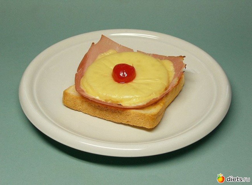 Гавайский тост представляет собой открытый сэндвич с ветчиной, плавленым сыром, вишней Мараскино и ананасом.
