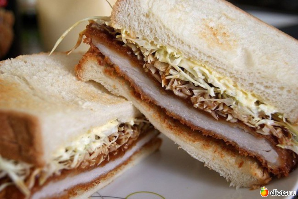 Кацу-сандо: мини-сэндвич с японской свиной котлетой (тонкацу) и рубленой капустой.